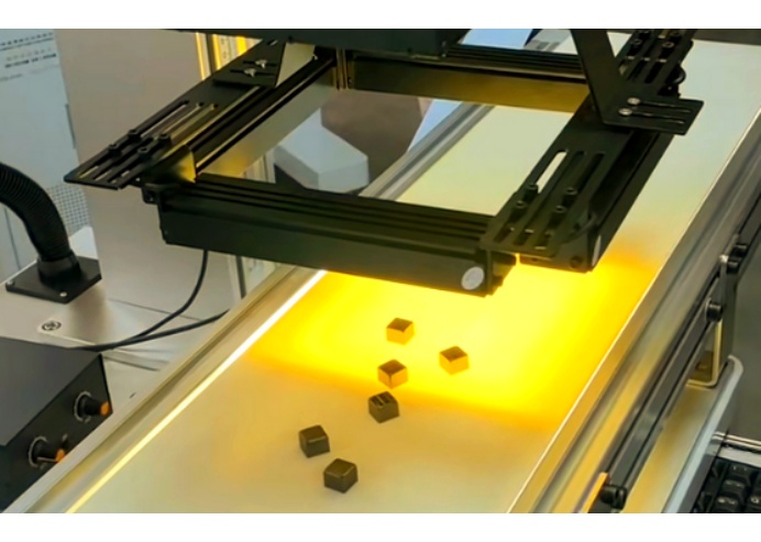 2.傳感器輔助定位:光電傳感器或視覺傳感器常用于檢測物料的位置和速度。光電傳感器通過發射和接收光信號,判斷物料是否到達打標區域,并觸發激光動作。視覺系統則使用攝像頭捕捉物料圖像,通過圖像處理算法實時分析速度向量,進而控制激光打標。這種方法靈活性高,適用于不規則形狀或顏色變化的物料,但可能受環境光干擾,需要額外的照明和濾波處理。